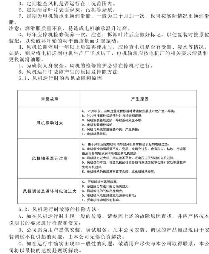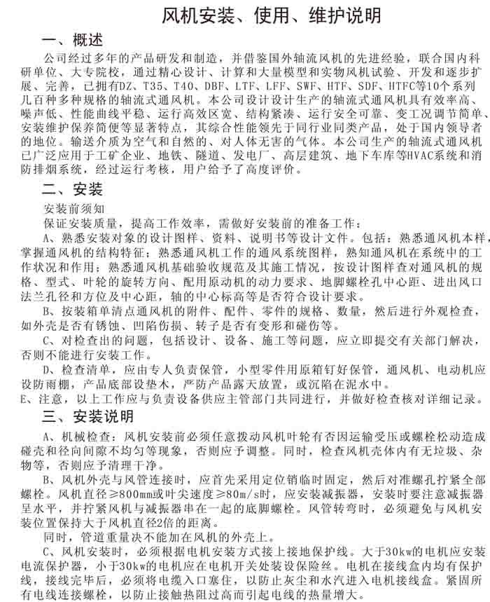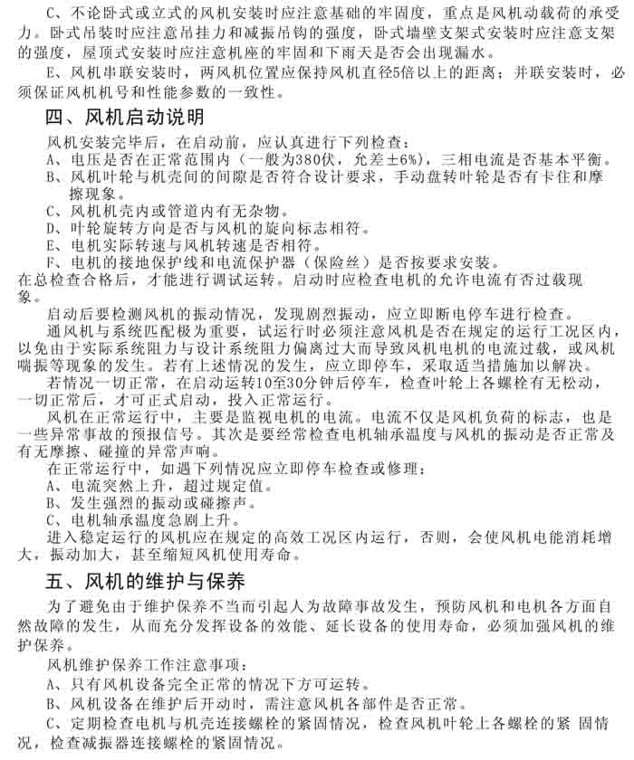 一、風機選用參考、安裝維護使用說明、常見故障分析、訂貨注意事項